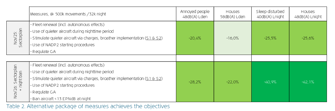 Viime kuussa julkistetuissa uusissa ehdotetuissa toimenpiteissä hollantilainen infrastruktuuriministeri Mark Harbers ehdotti 460 000 ja 470 000 lentoonlähtöä ja laskeutumista vuodessa, mikä on odotettua enemmän, vaikka yölennot vähennetään 32 000: sta 27 000: een. Lisäksi kovimmin tason lentokone, joka sisältää Boeing 747: n, kielletään yöllä toiminnasta, mikä osoittaisi tietyn iskun rahtilentoyhtiöille, joilla on taipumus lentää quadjetin yön yli -segmenteillä.