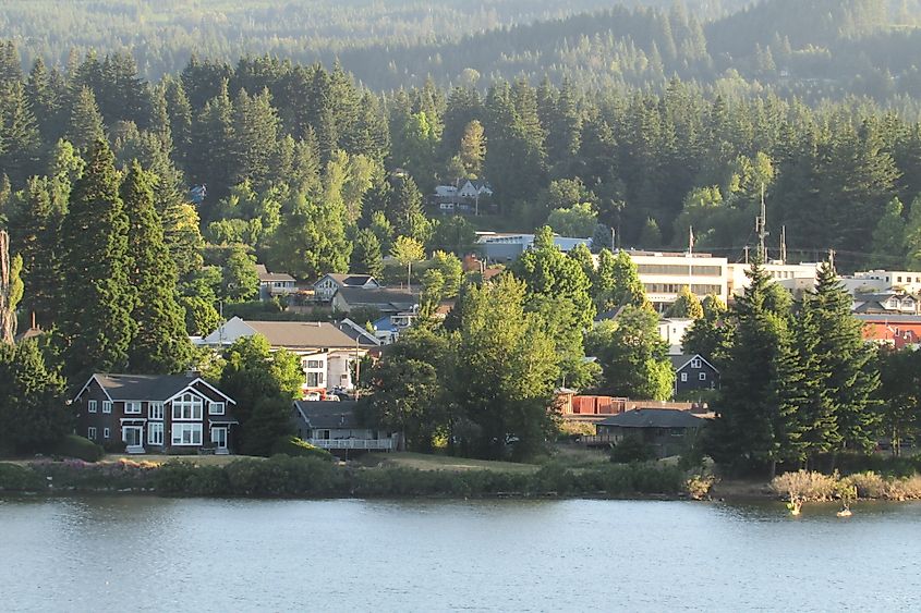 Stevenson, WA, ranta, jossa on koteja ja metsäisiä kukkuloita. Chris Light, CC BY-SA 4.0, Wikimedia Commons
