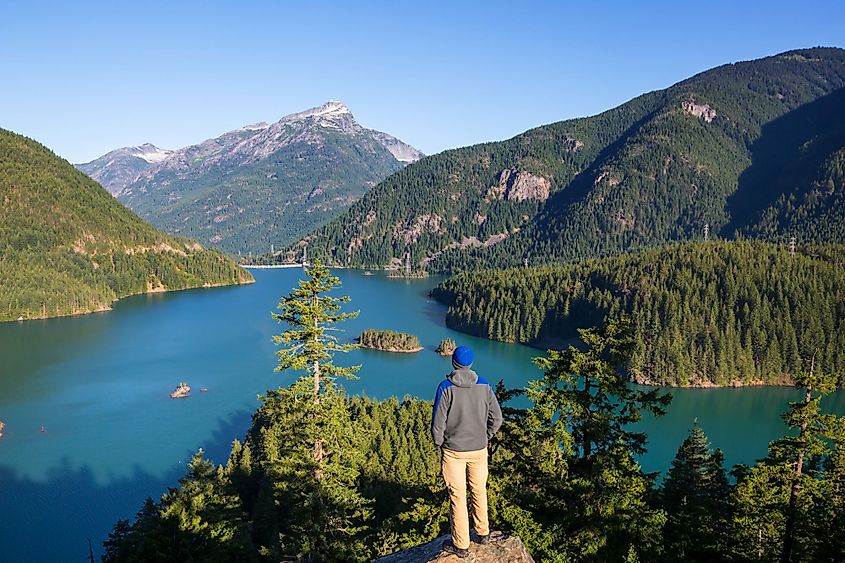 Retkeilijä, joka katselee Diablo -järveä Pohjois -Cascadesin kansallispuistossa, Washington.