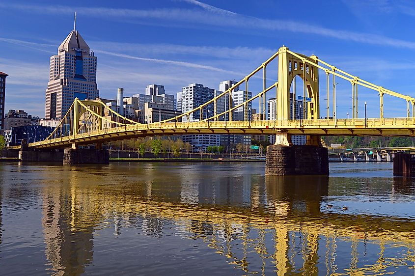 Keltainen kuudes kadun silta Pittsburghissa, Pennsylvaniassa, heijastaa Allegheny -joen rauhallisia vesiä. Toimitusluotto: James Kirkikis / Shutterstock.com