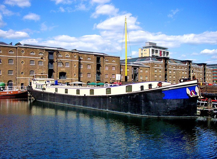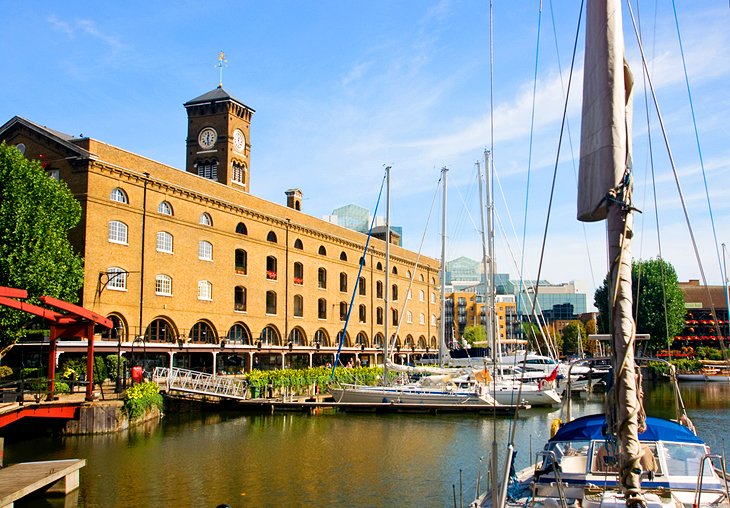 St. Katharine Docks, jota pidetään slummina, on nyt yksi Lontoon elvyttävistä alueistaEast Endja on onnistunut pitämään suuren osan alkuperäisestä luonteestaan. Se on helposti saavuttanut Thames Clipper -lauttapalvelu Greenwichistä.