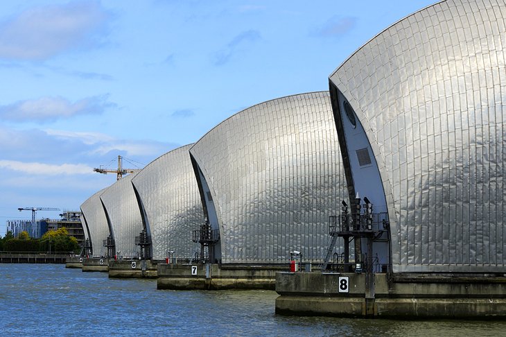 Thames -este rakennettiin joen yli lähellä Woolwichia, vain muutaman mailin päässä Greenwichistä, vuonna 1984, jotta tulvat ylävirtaan. Tämä tekninen mestariteos, 569 metriä leveä, on maailman toiseksi suurin siirrettävä tulvaeste ja istuu valtavien laiturien yläpuolella, jotka tukevat teräsportteja, jotka pitävät tulvavedet poissa.